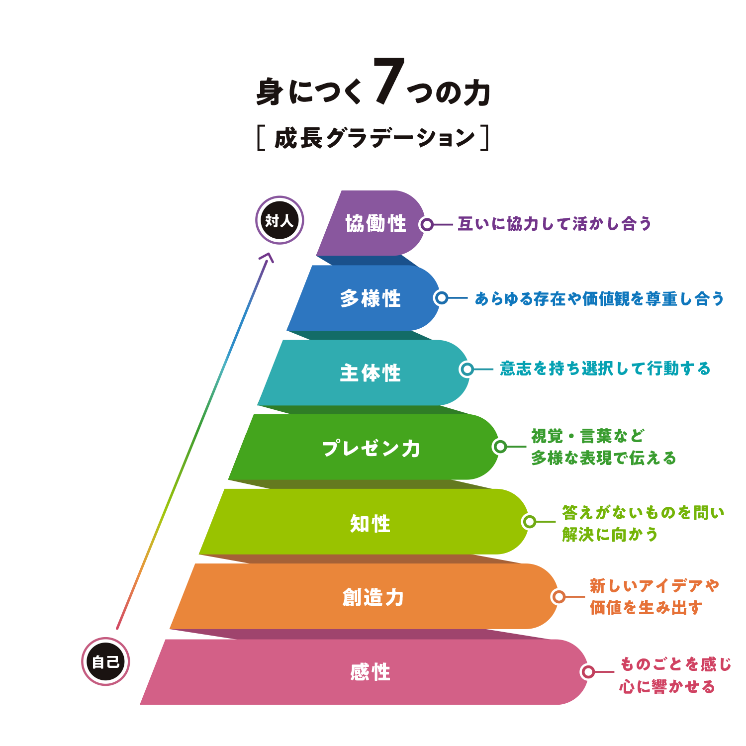- 主体的な学びで、自己認識、自己肯定、意欲、共感性の土台が育つ